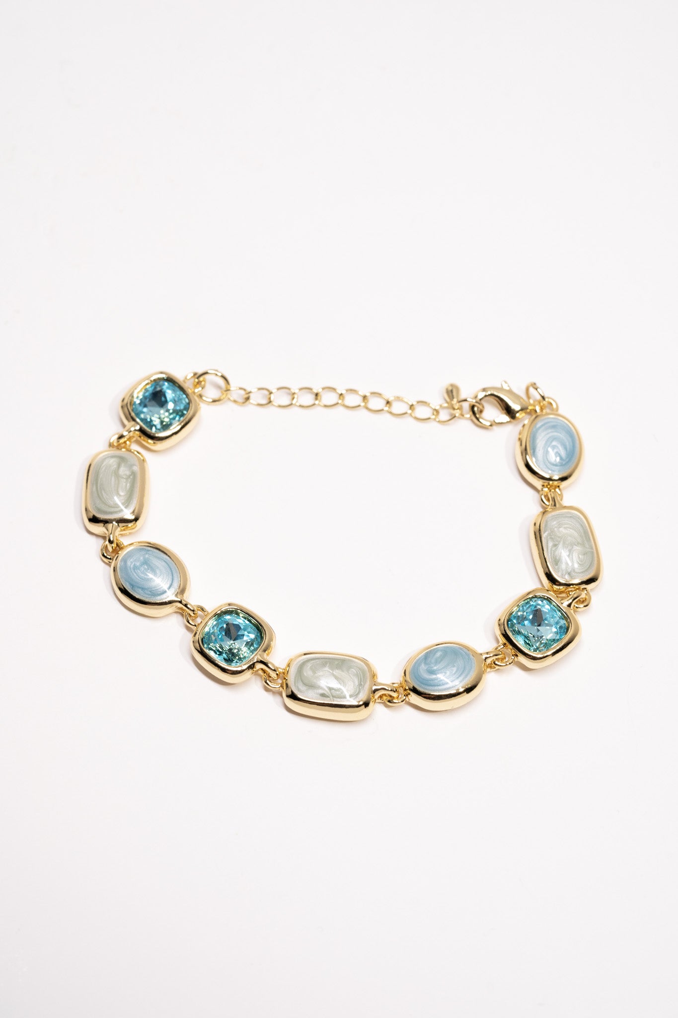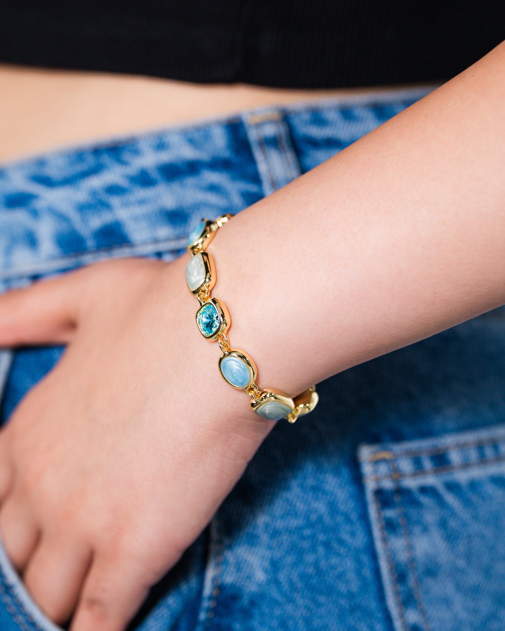 Aqumarin Bileklik, doğanın serin maviliğinden ilham alan tasarımıyla bileğinize huzur dolu bir şıklık katıyor. Altın kaplama çerçeveler içine yerleştirilen su tonlarındaki doğal taşlar ve zarif mavi zirkon detayları, sakinlik ve zarafeti bir arada sunar. Oval ve köşeli formların dengeli geçişleri ise modern ve estetik bir duruş sağlar.