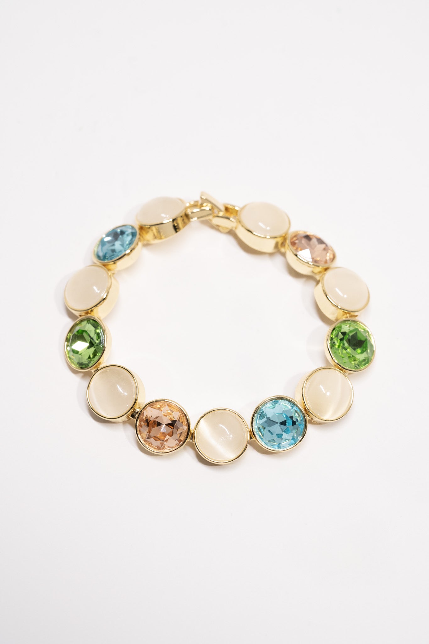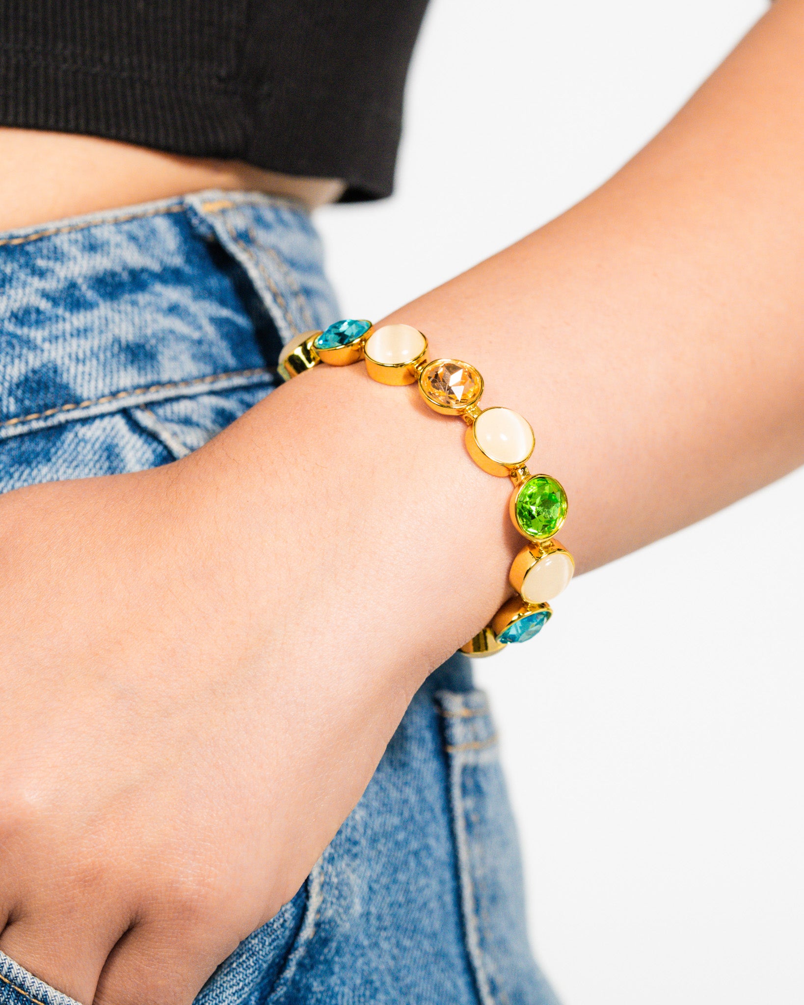 Renkly Bileklik, zarafet ve canlılığı bir araya getiren modern tasarımıyla dikkat çeker. Farklı renklerdeki büyük yuvarlak taşlar, altın tonlu bileklik gövdesiyle mükemmel bir uyum yakalar. Hem gündelik kombinlerinize enerji katmak hem de özel günlerde stilinizi tamamlamak için ideal bir aksesuardır.