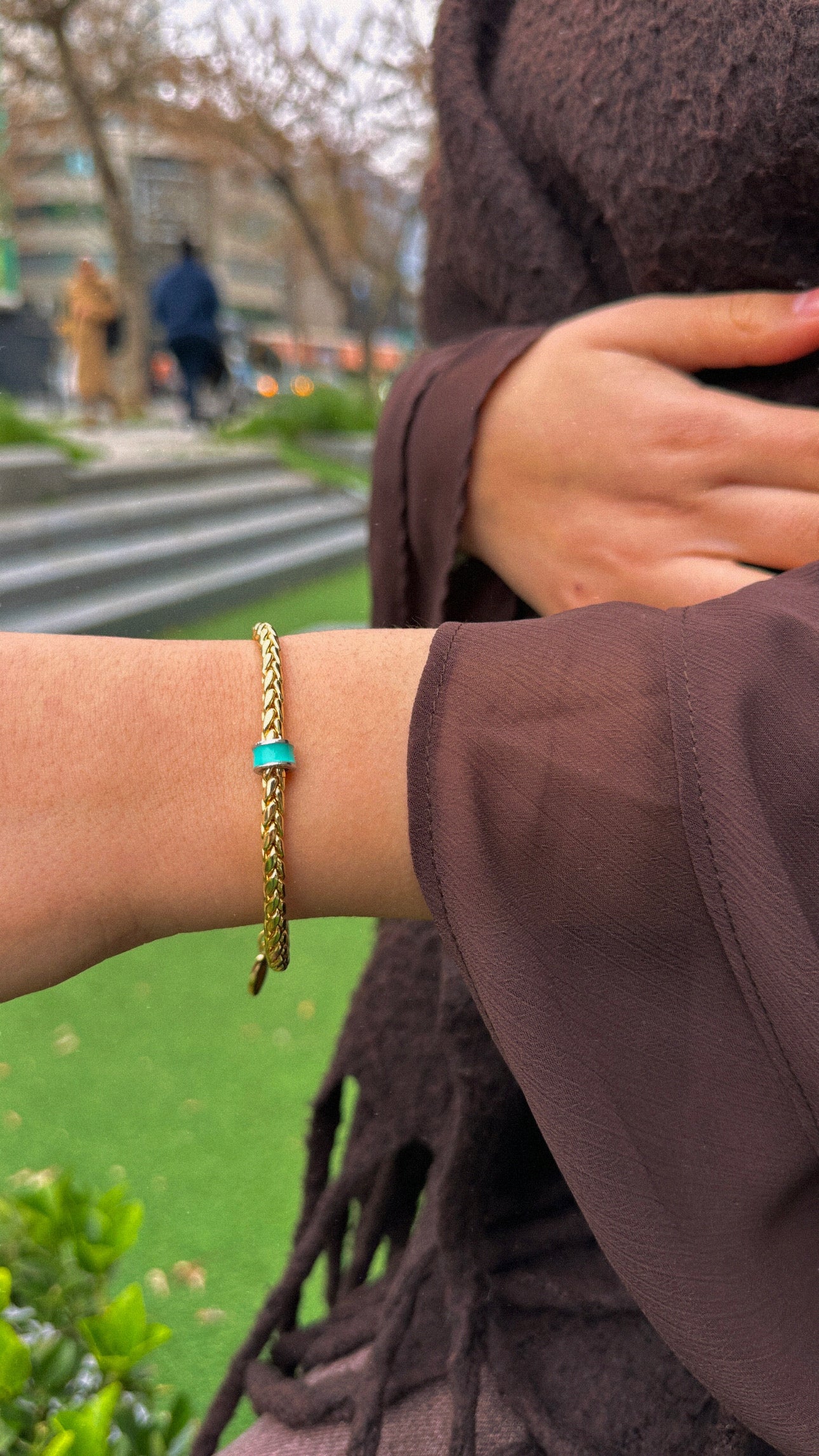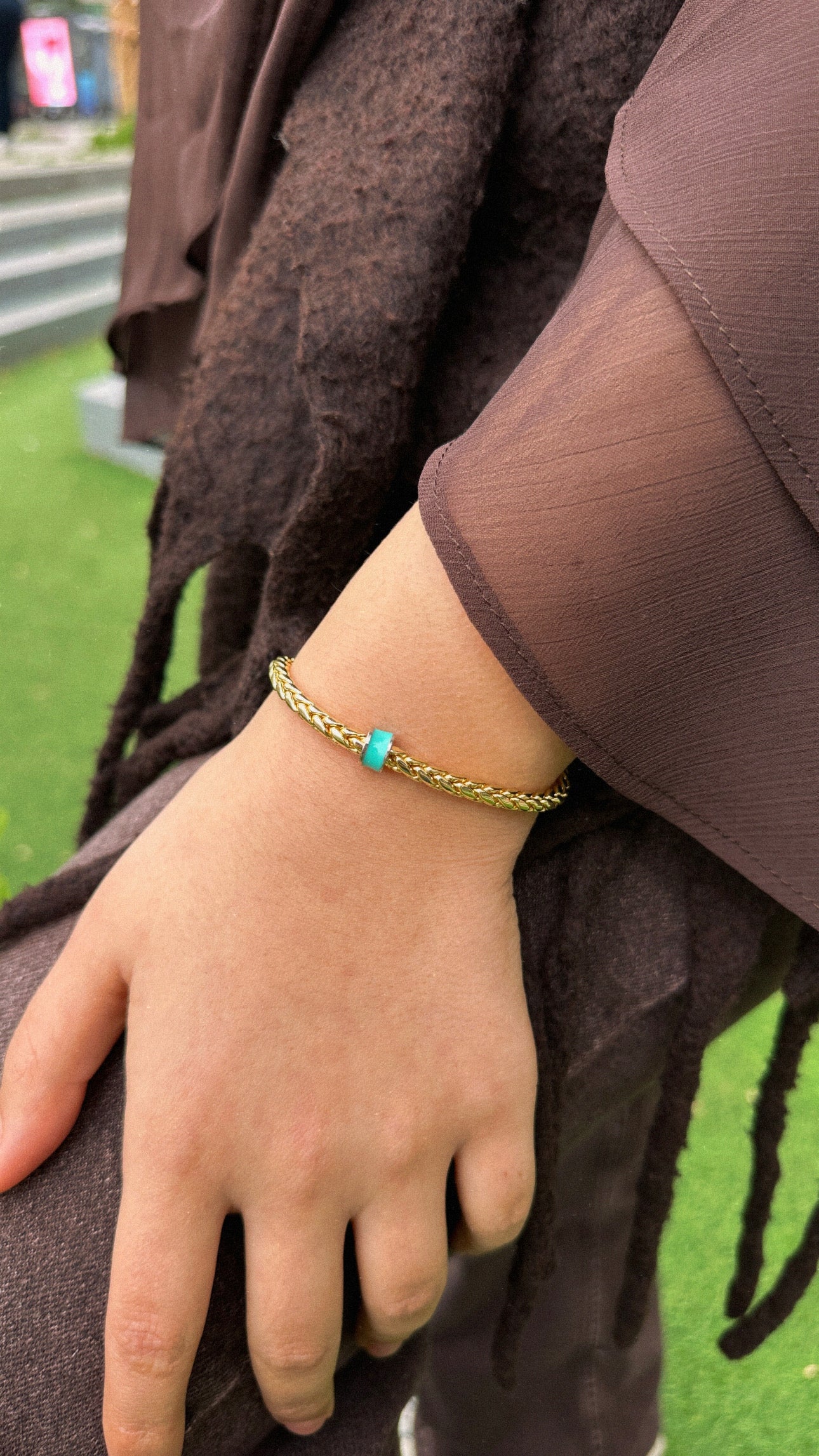Altın tonlu örgü zincirle zamansız stil