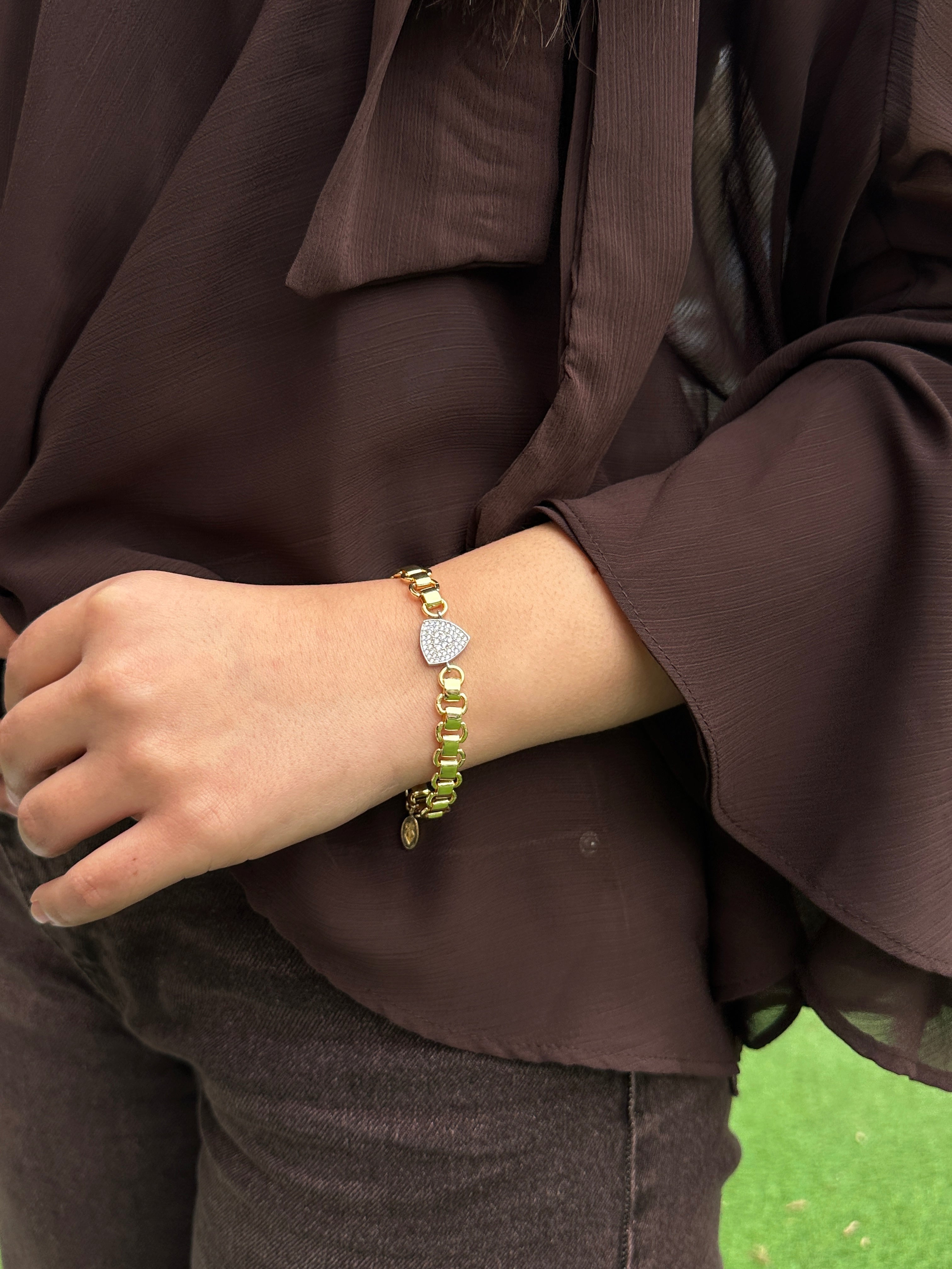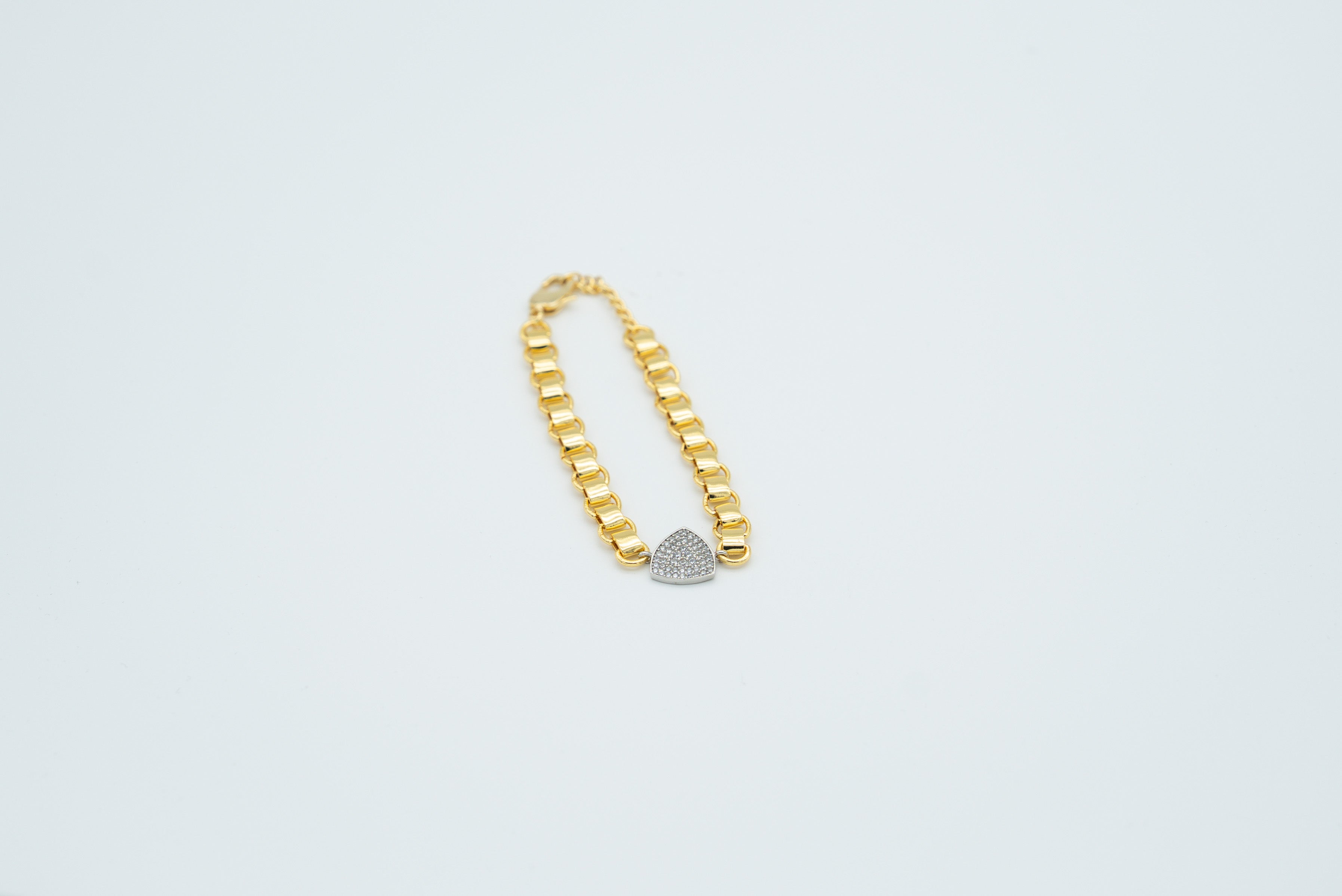 Vip Wind Beyaz Zirkon Taşlı Bileklik, modern zincir yapısı ve zarif beyaz zirkon taş detayıyla güçlü bir şıklık sunar. Altın tonlu metal dokusu, ortasında yer alan üçgen formdaki beyaz zirkon taşla dengelenerek bilekte sofistike ve dikkat çekici bir duruş yaratır. Günlük kombinlerden özel davetlere kadar her stile kolayca uyum sağlar.
