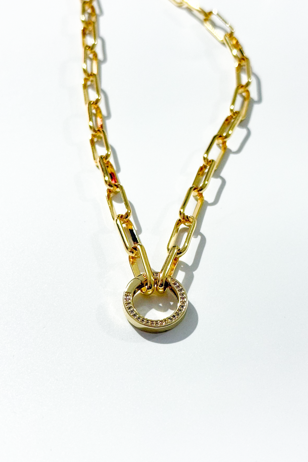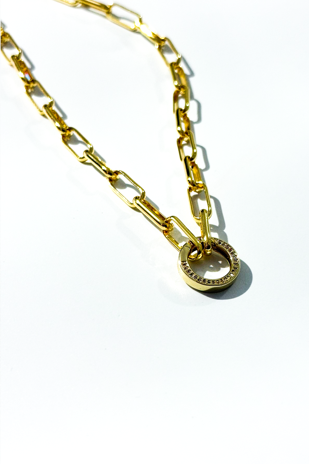 Tf Taşlı Ataç Kolye, modern ataç zincir formunu taşlı halka detayıyla birleştirerek güçlü ve şık bir görünüm sunar. Altın tonlu zinciri ve ışıltılı taşlarla çevrili dairesel formu sayesinde sade ama dikkat çekici bir stil yaratır. Günlük kombinlere modern bir dokunuş katarken, özel anlarda da zarif bir tamamlayıcı olarak öne çıkar.