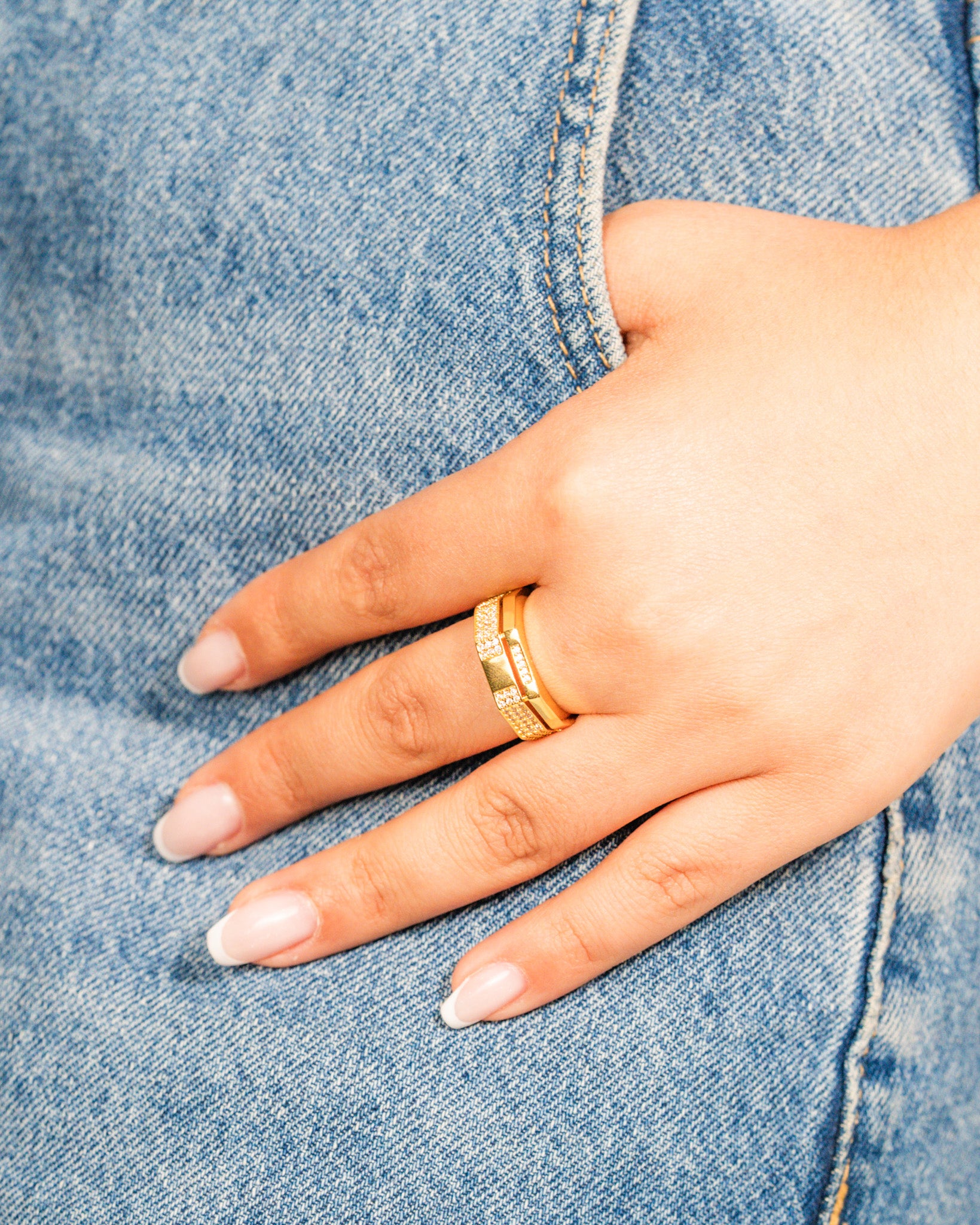 Damali Yüzük, köşeli hatları ve zarif damalı taş detaylarıyla modern şıklığın dikkat çekici bir yorumudur. Sekizgen formu ve parlak altın kaplama yüzeyiyle klasik tasarımlardan ayrılarak güçlü bir siluet sunar. Mikro zirkon taşların ince işçiliğiyle oluşturulan damalı desen, yüzüğe sofistike ve dinamik bir karakter kazandırır.