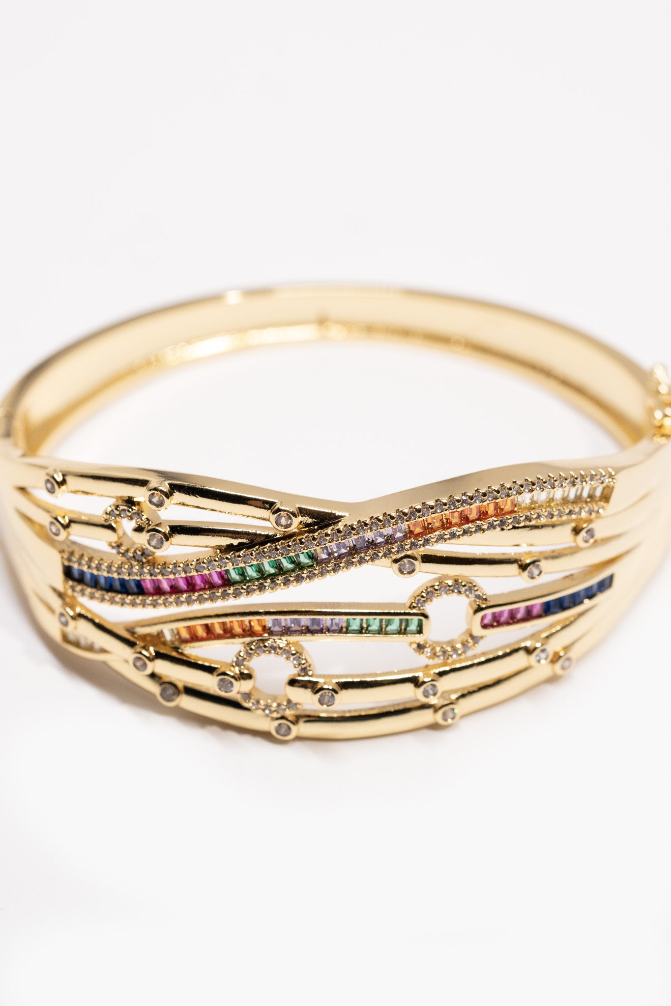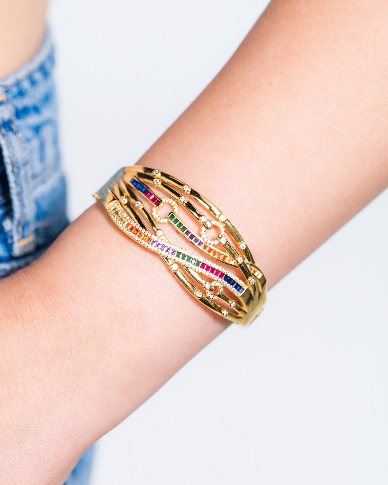 Billy Kelepçe, renklerin enerjisini zarafetle buluşturan ve modern çizgileriyle öne çıkan etkileyici bir tasarımdır. Altın kaplama yüzey üzerine yerleştirilmiş renkli baget kesim taşlar ve pırlanta görünümlü yuvarlak zirkonlar, bileğinizde adeta bir sanat eseri gibi parlar. Kavisli formu ve dairesel detayları, bileklik boyunca akıcı bir şıklık sunar.