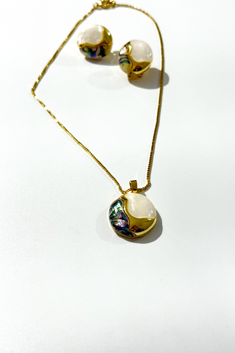 Mozaik Set, yuvarlak formdaki kolye ucu ve uyumlu küpeleriyle sofistike bir bütünlük sunar. Işığı farklı açılardan yansıtan mozaik görünümlü yüzeyi, altın kaplama detaylarla birleşerek zarif ve dikkat çekici bir stil oluşturur. Günlük kombinlere modern bir dokunuş katarken, özel davetlerde de şıklığı tamamlayan güçlü bir aksesuardır.