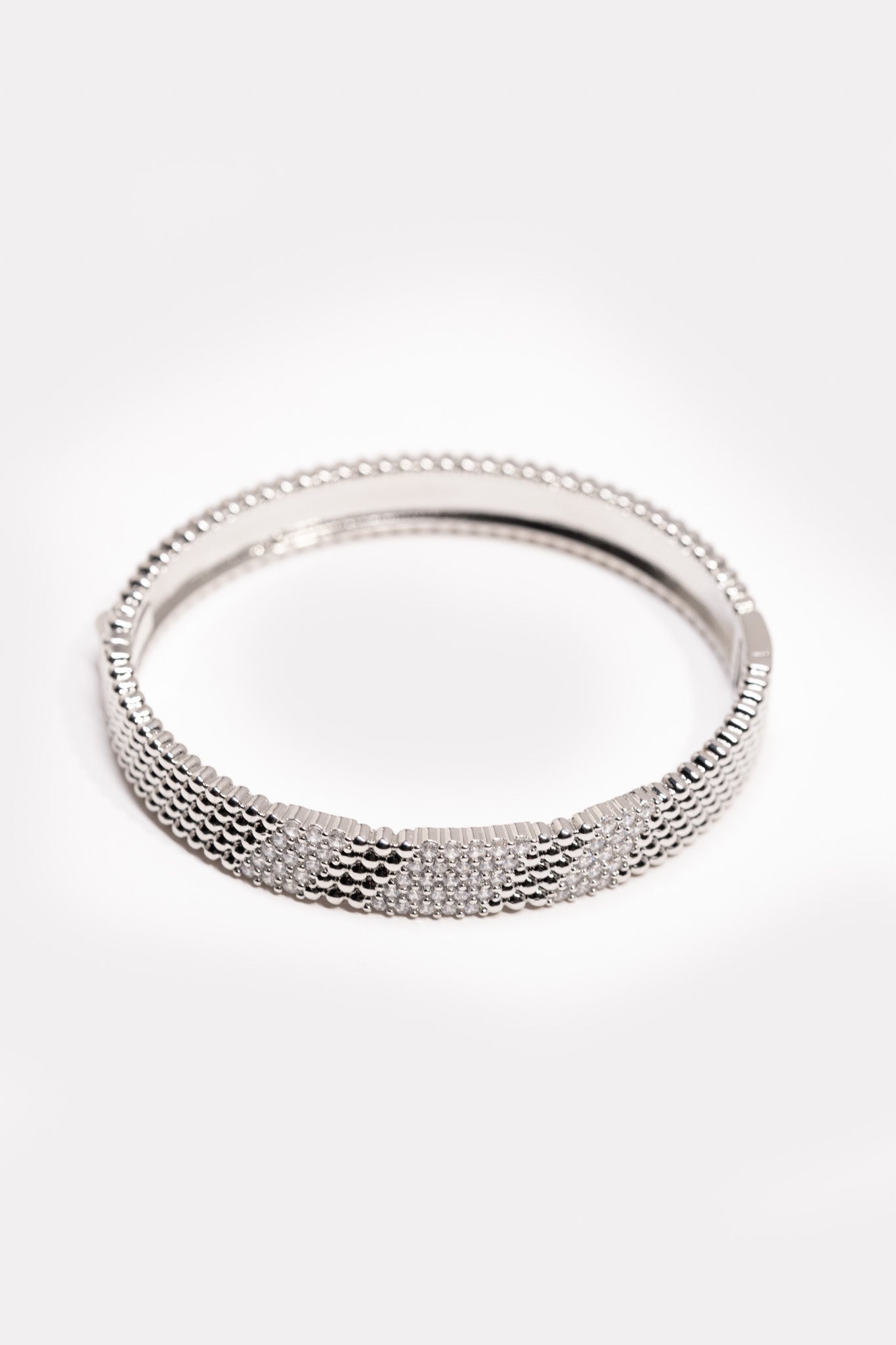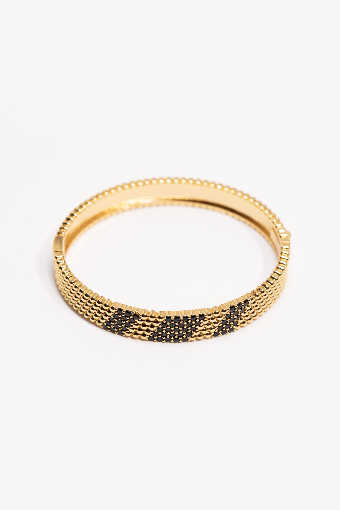 Vanclove Kelepçe, siyah taşlı geometrik deseniyle dikkat çeken zarif bir bileklik modelidir. Altın tonundaki yüzeyle kontrast oluşturan bu koyu detaylar, bilekliğe sofistike bir hava katar.